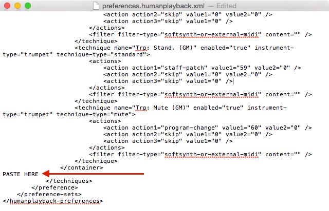 - CONTROL+click (or right-click) the file preferences.humanplayback.xml and choose Open With > TextEdit.