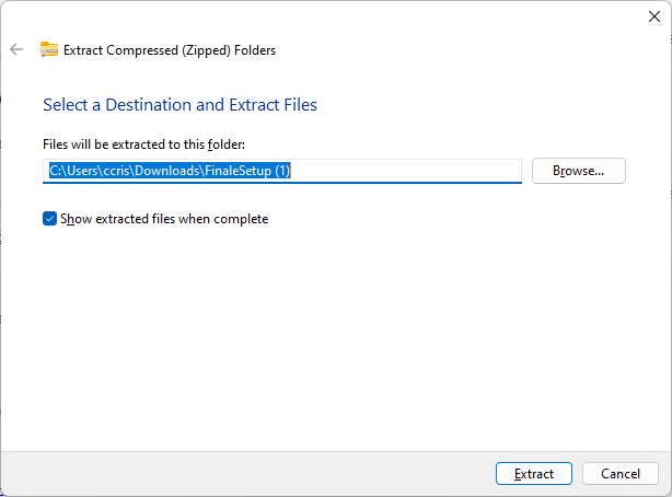 You need to set up the extraction destination folder before you tell Finale where it is. Finale will not create the folder for you.