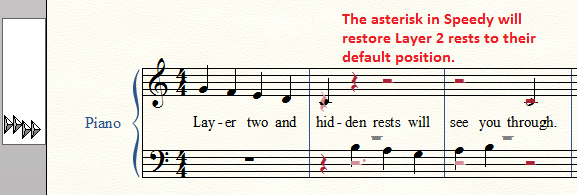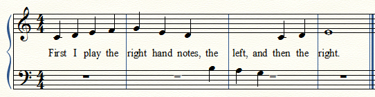 Problem: I am creating some easy five finger piano -- middle C position-- pieces where the melody weaves between the left and right hand. I can't get the lyrics to stay in between the staves, the ones clicked to the bass clef notes are drifting down below that staff. Is there a fix or do I have to create two separate lyrics breaking things up as to the words that go with one staff and vice versa.