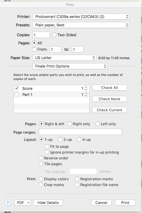 When you select Print, look for Finale Print Options in the Page Layout drop-down menu. Find and select it. You'll now see many print and layout options including Score, Parts, Pages • Right and left, Fit to Page and Ignore printer margins for n-up printing.