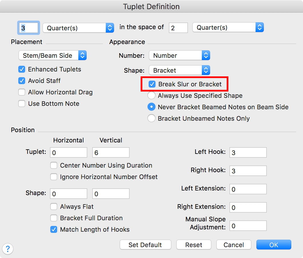 I am writing triplets and would like to have a space in the bracket for the number. At the present time when I write the triplet it comes out with a solid bar with the number imposed on the bar. Is there a way to create this space? I am using Finale 14.5, Mac version