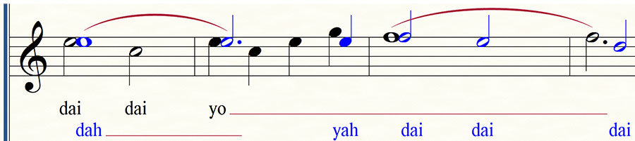 1) in first measure you don't see a black and blue "F" note - they are a single note - though they are the same note (both "F" quarter notes), it seems important that they are considered separately since they carry different lyrics (see "before" picture)