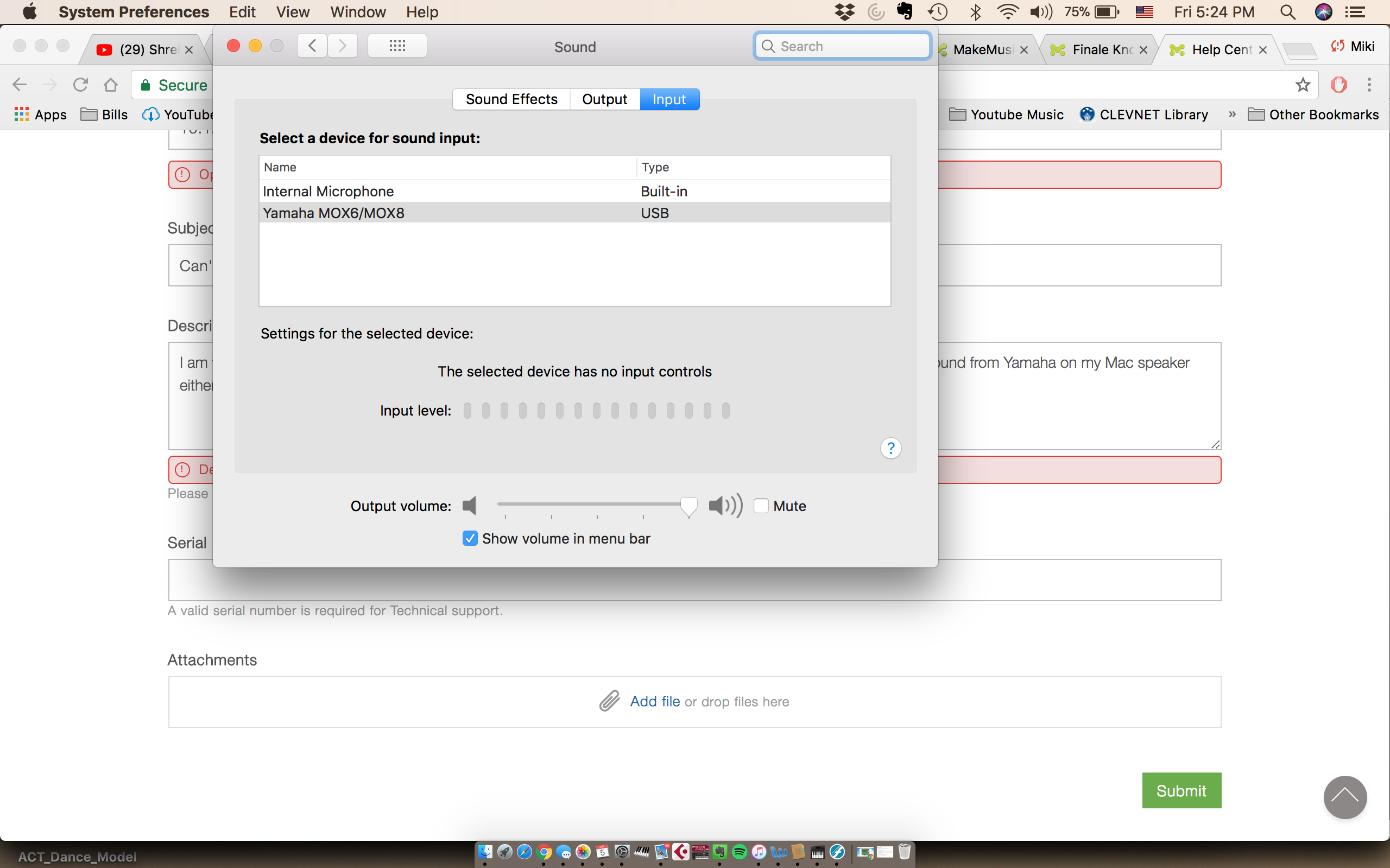 I am using Macbook Pro - High Sierra Version 10.13.2 - I am trying to set up my Finale I newly purchased. I want to add notation by playing my Yamaha MoX8, but nothing is showing up on the staff. I cannot hear any sound from Yamaha on my Mac speaker either. Finale's MIDI internal speaker shows it is connected to Yamaha, however (please see the attached picture). I have also attached a picture under my Macbook's System Preference - Sound. Please help. Thank you very much.