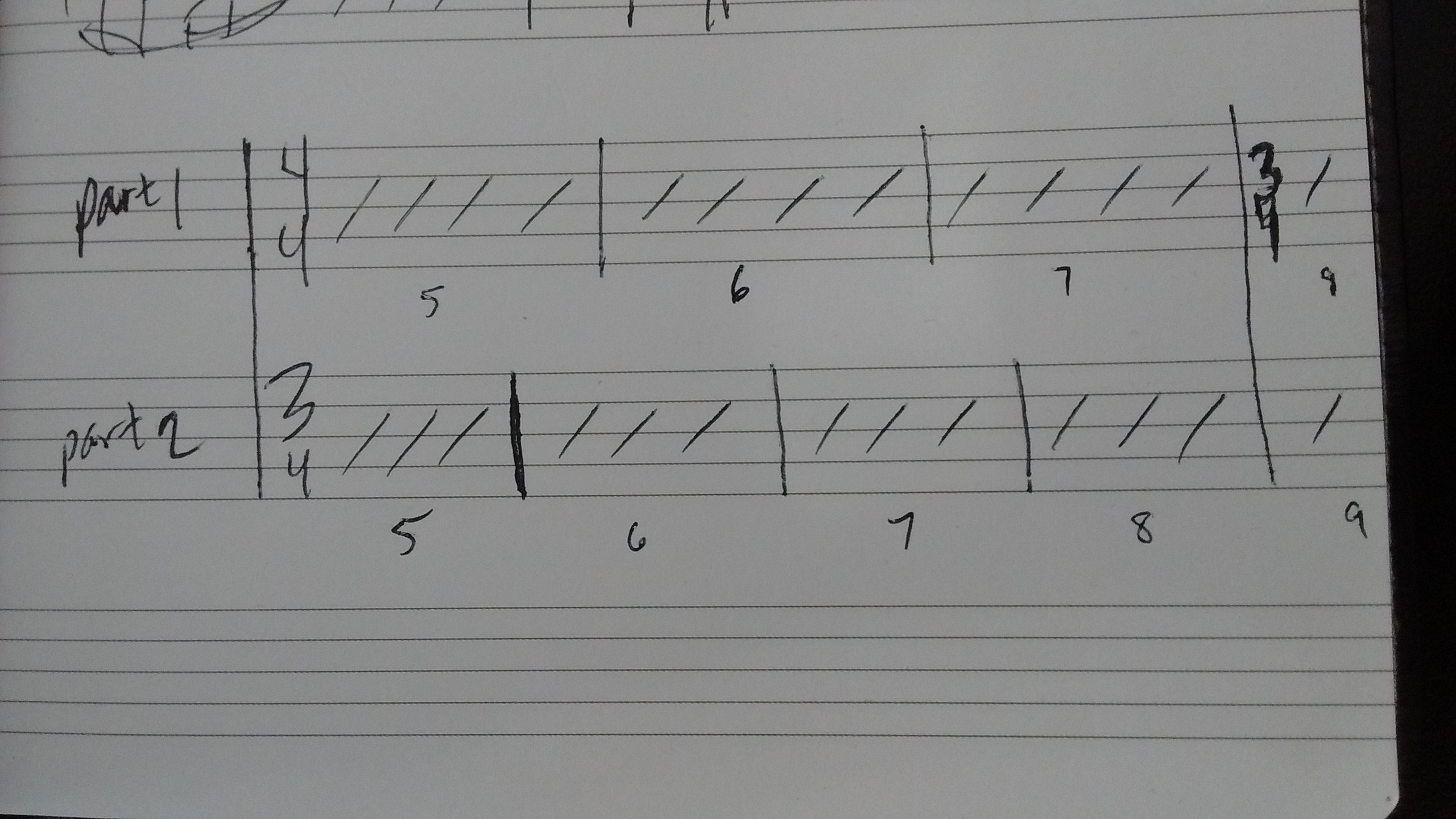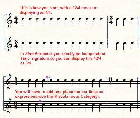 Is this possible in Finale? Independent time signatures didn't allow me to reconcile the measure time difference (it would give me 4 measures of 4/4 on top and 4 measures of 3/4 on bottom), and independent TS with Split Measure plugin just crashed the program. Without independent TS, I can use split measure once, but when I try to split another measure, Finale crashes (you can imagine how I'd try to simulate the goal by hiding or showing various barlines).
