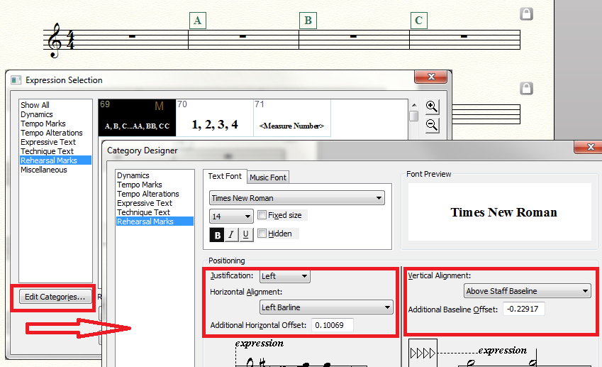 2. If needed, add a Horizontal Offset to the Rehearsal Marks category from the Category Designer.
