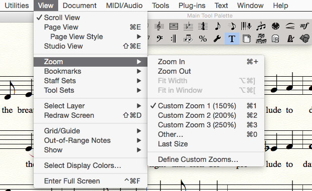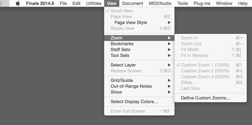 Finale 2014.5 for Macintosh intermittently loses the shortcut for zooming out once a document is open. I have been using the zoom out shortcut all morning then it stopped working. I restarted the computer and restarted Finale and the short cut won't stay when I open a new document or a file I have been working on.
