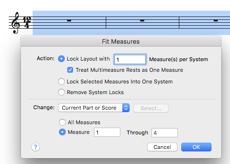 2. Choose the Selection Tool, select the measures and then choose Utilities: Fit Measures (Mac command-shift-M) and fill in the dialog box: