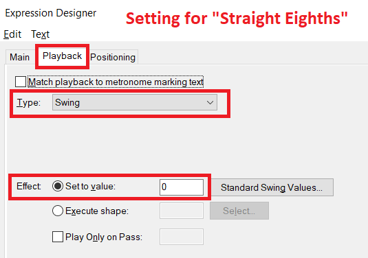 Go to the Expression tool panel, and choose Tempo Marks. Click Create New Expression (or something like that.) in the text screen, type in “straight eighths,” or what ever you want. Then tap the playback tab on that window. In that window in Effect, choose Swing, and set it to zero.