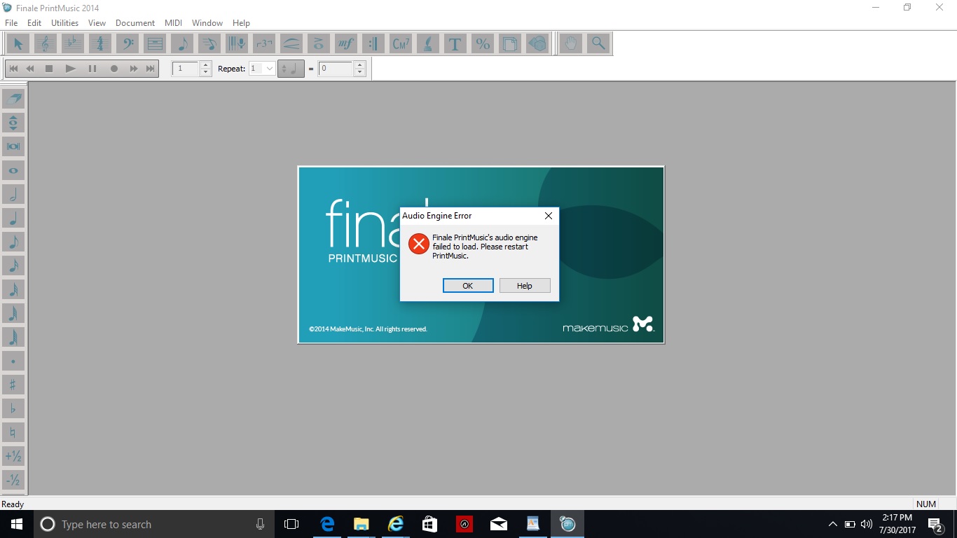 Hi, everyone! I just downloaded PrintMusic 2014 for Windows 10. The initial error message I receive at every startup is, "audio engine failed to load, please restart." Which may lead to the reason why I am not getting any sound. On top of that, if I try to use the iRigKeys25 MIDI keyboard that I just purchased, it cause the program to freeze. I may have bought the MIDI keyboard a bit premature to figuring out PrintMusic first. Don't see why it should make it freeze. Thanks for your time!