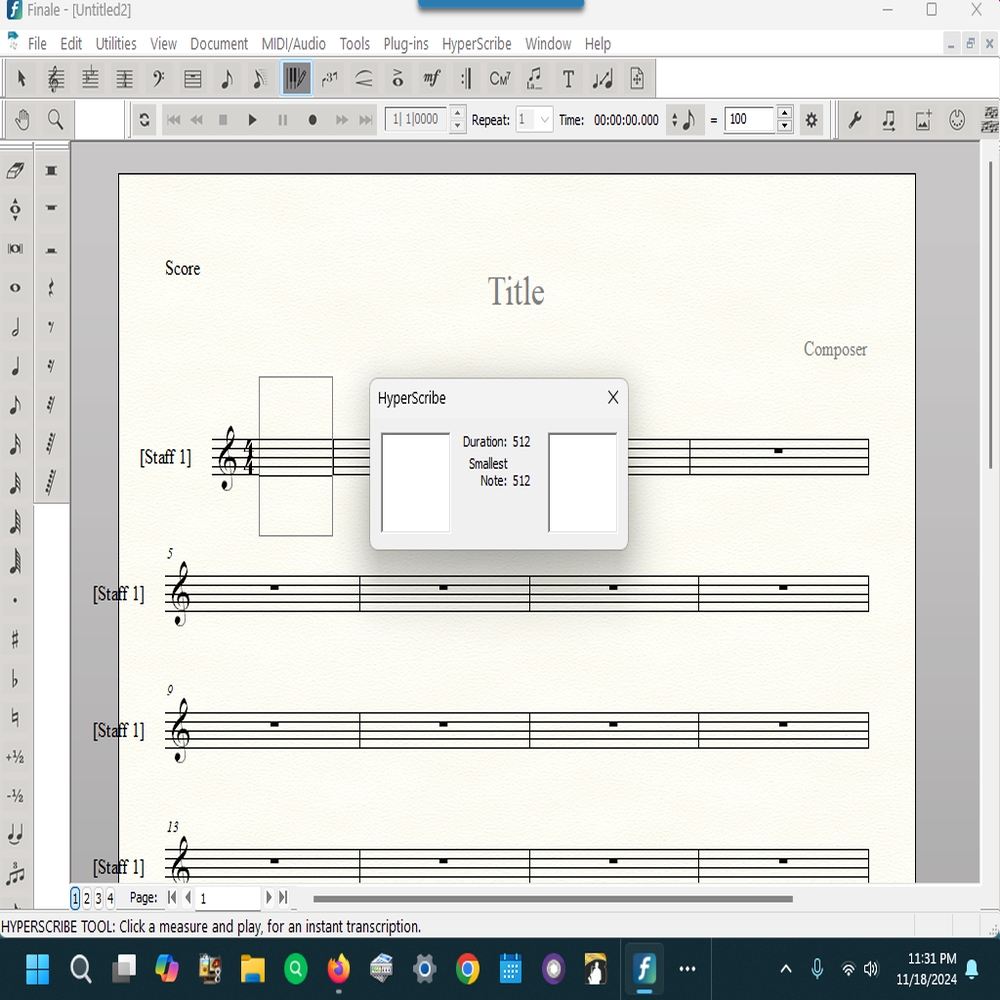 I have set it and re-set it MANY MANY times ro "receive ALL channels" but every time I re-0pen that window I See that it has reverted back to receive "only channel". So I click on HYPERSCRIBE, click in a bar of a single stave, the box comes up on the bar where i click, the metronome begins clicking, but after waiting 2 bars and I begin to play there are NO NOTES appearing on the stave, and nothing is recorded.