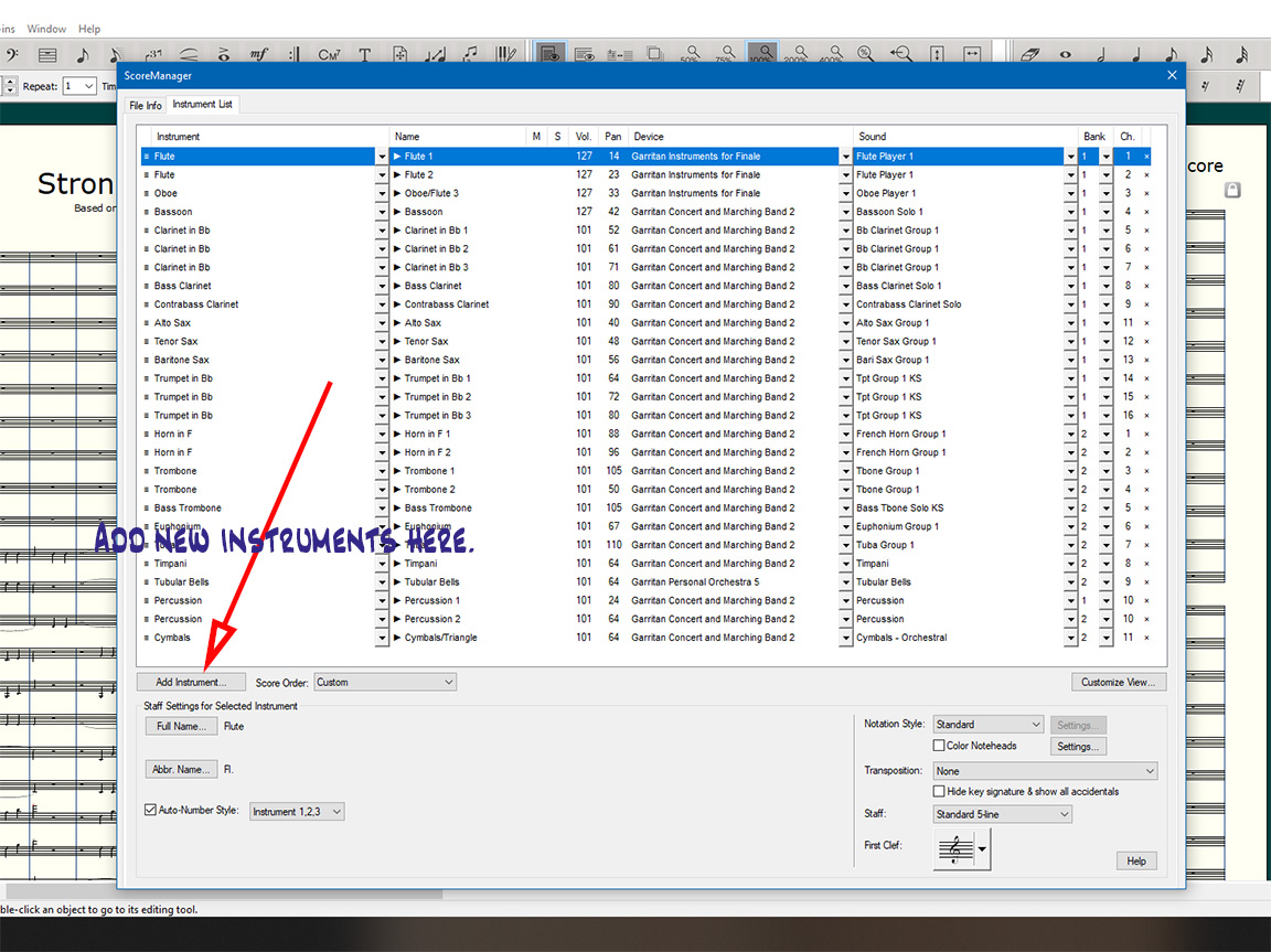 Window>Score Manager> Add Instrument