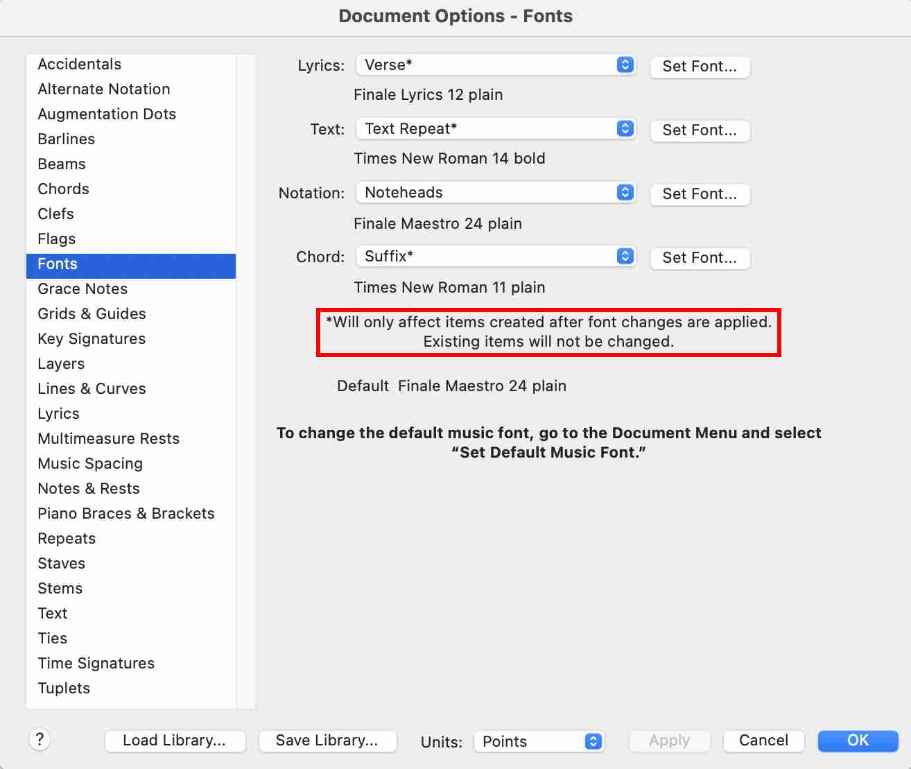 I've tried to create items after font changes are applied. Nothing happens. It remains the same font. What used to happen is that this setting would change all of the suffix fonts so that if the suffix fonts were a combination of Maestro and Arial, and I wanted Broadway copyist, it would change everything to Broadway copyist. Since this font set didn't contain some of the symbols that Maestro contained I used to either get a different symbol or the ubiquitous question mark. For me this setting is to be avoided as it does not produce the intended result.