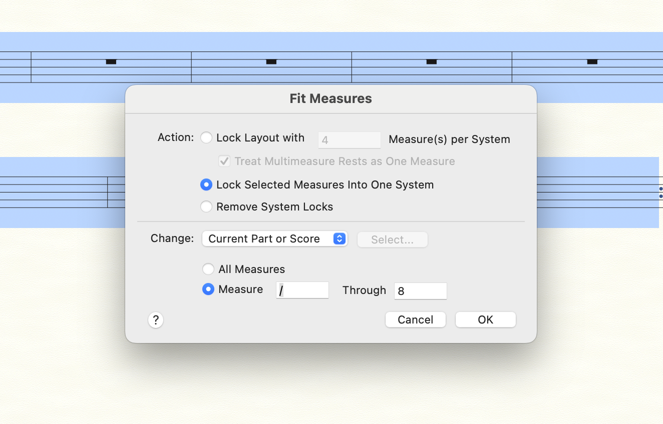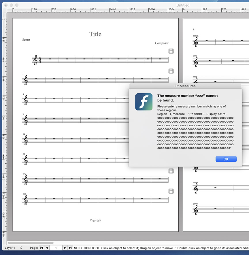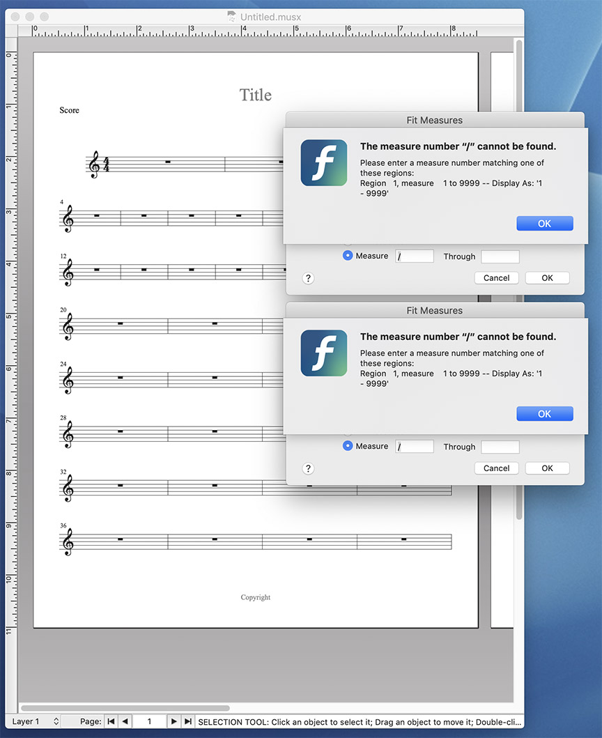 When I work with the Fit Measures dialog and unintentionally enter a '/' in the start measure text field, followed by return, Finale stops working and requires force quit.