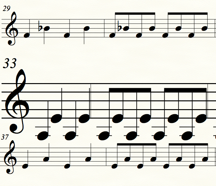 Measures 33-36 are much too large. I tried the page layout tool and the note size tool, but could not find a way to correct it. I also tried deleting and moving measures, and found that the size is associated with the system, so as measures move into this particular system the size increases.