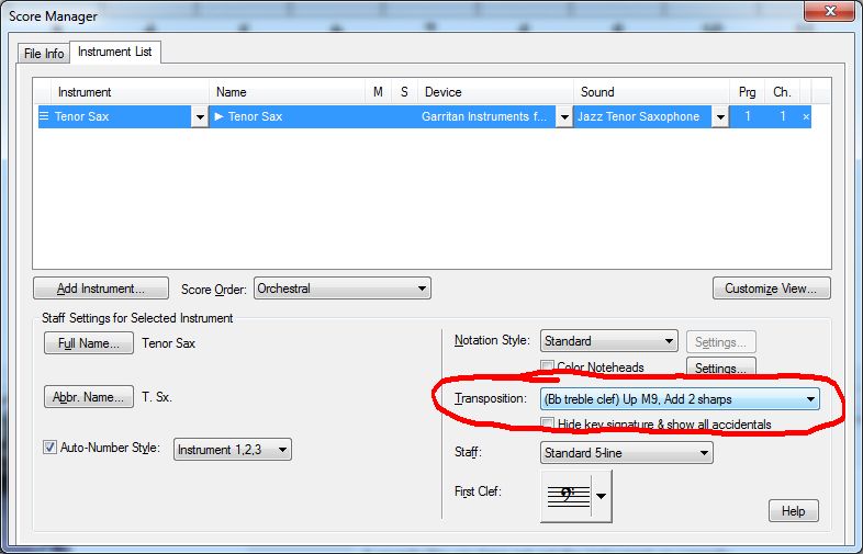 I'm writing a tenor sax part and I am writing the notes the required 9th above, but they aren't sounding in concert pitch. The sax staff has the correct key signature but the playback isn't transposing. What do I need to do to get it to sound in the right key?