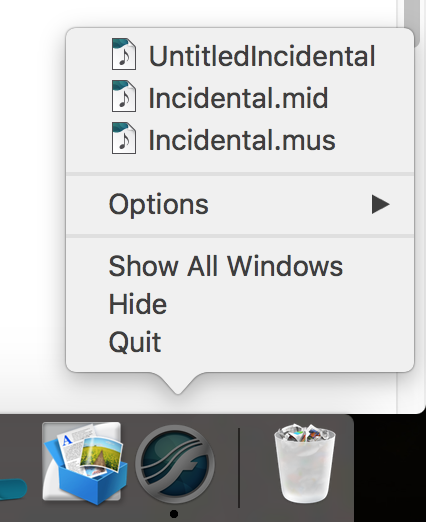 2) The Quit option on the Docket is supposed to be available, but when you click on it, Finale does not quit either. The Docket Finale shows versions of the files I was working on, which may automatic be bak ups I cannot send to the trash basket either; I guess this must be the reason for Finale not quitting.