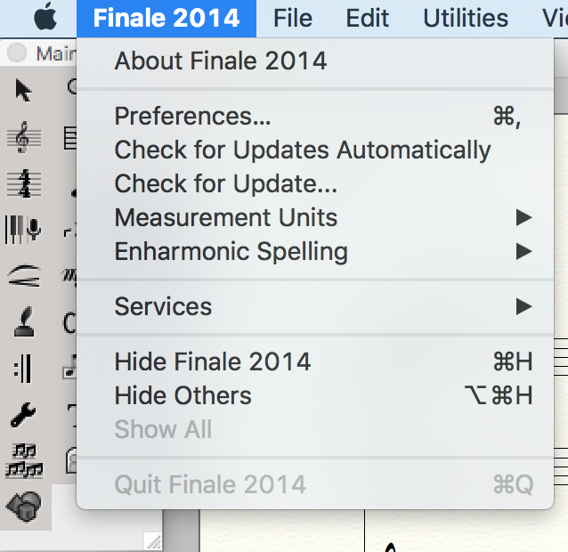 1) The main menu does not allow to quit finale (Quit Finale is disabled), as the image shows: