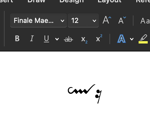 For decades I have been using af combination of Finale and MS Word for different text based material. Typically combining music examples and text but also using singe symbols in the text from the various fonts, MM have develop over the years. Suddenly with a new Microsoft office (Mac) and a new mac, none of the fonts are available in Word; either the show as a plain text font (no symbols) or they do not show up in the menus at all. All my symbols in the documents are substituted with "calibre" or something like that.