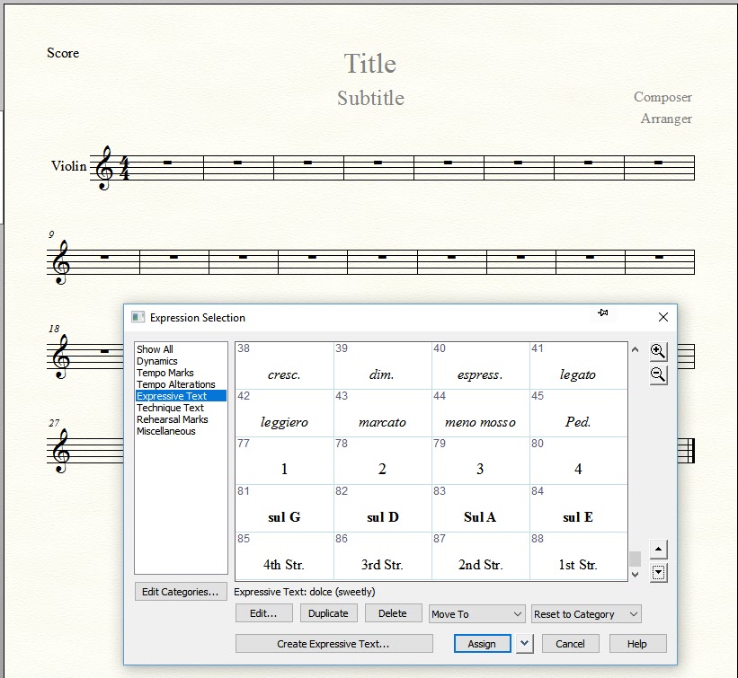 To solve this I created these marking in a document's expression's tool under "text expressions" and then I saved them to a library file called 'Violin.', importing the text expressions I had just created.