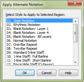 When I choose the staff tool and select apply alternate notation I have 4 options listed (not numbered) but when I check the user manual I'm supposed to get a box that looks like this