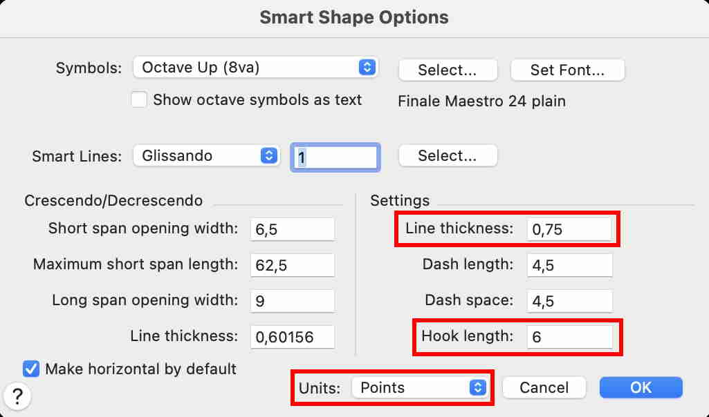 Mac Finale has a window / dialog box called Smart Shape Options (Smart Shape menu > Smart Shape Options…).
