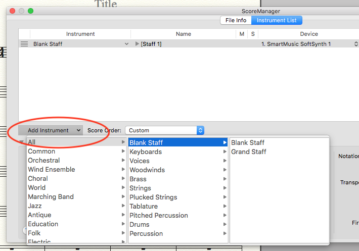 There are a number of ways. I would go to the Score Manager, and in the Instrument List panel, choose Add Instrument...