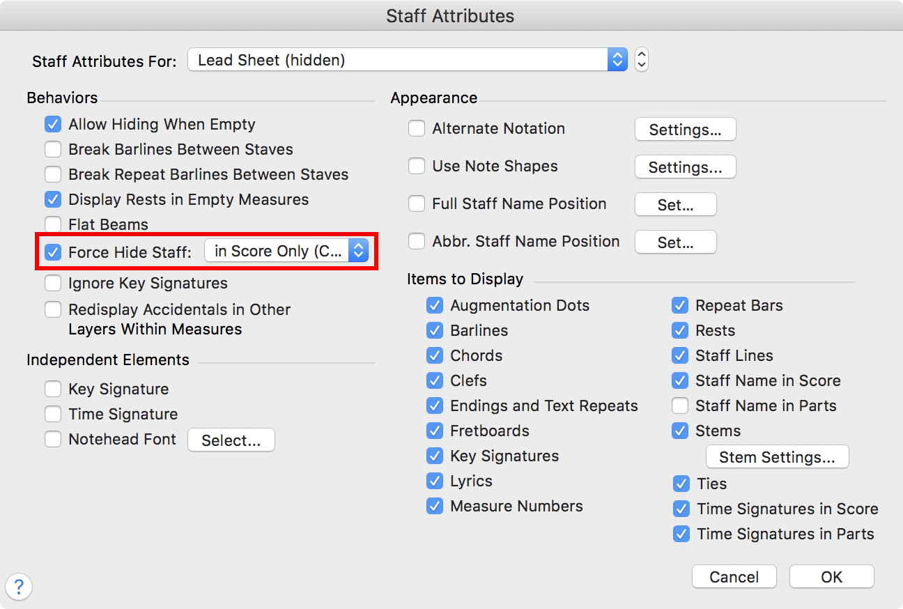 For each staff, check whether the staff has “Force Hide Staff” selected.