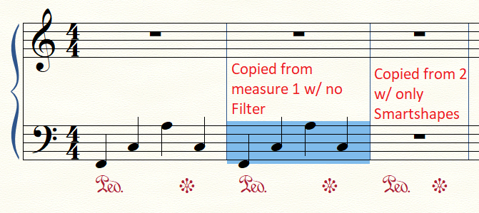 I just created a sustain pedal pattern on a single measure. I now want to copy it onto subsequent measures: but Finale doesn't seem to allow it. I've tried "dragging copies music" and dragging the measure, as well as CTRL-ALT-clicking on the target measure, and I get a dialog box asking how many times I want to copy the MIDI data, but after clicking 'OK' the pattern isn't copied.