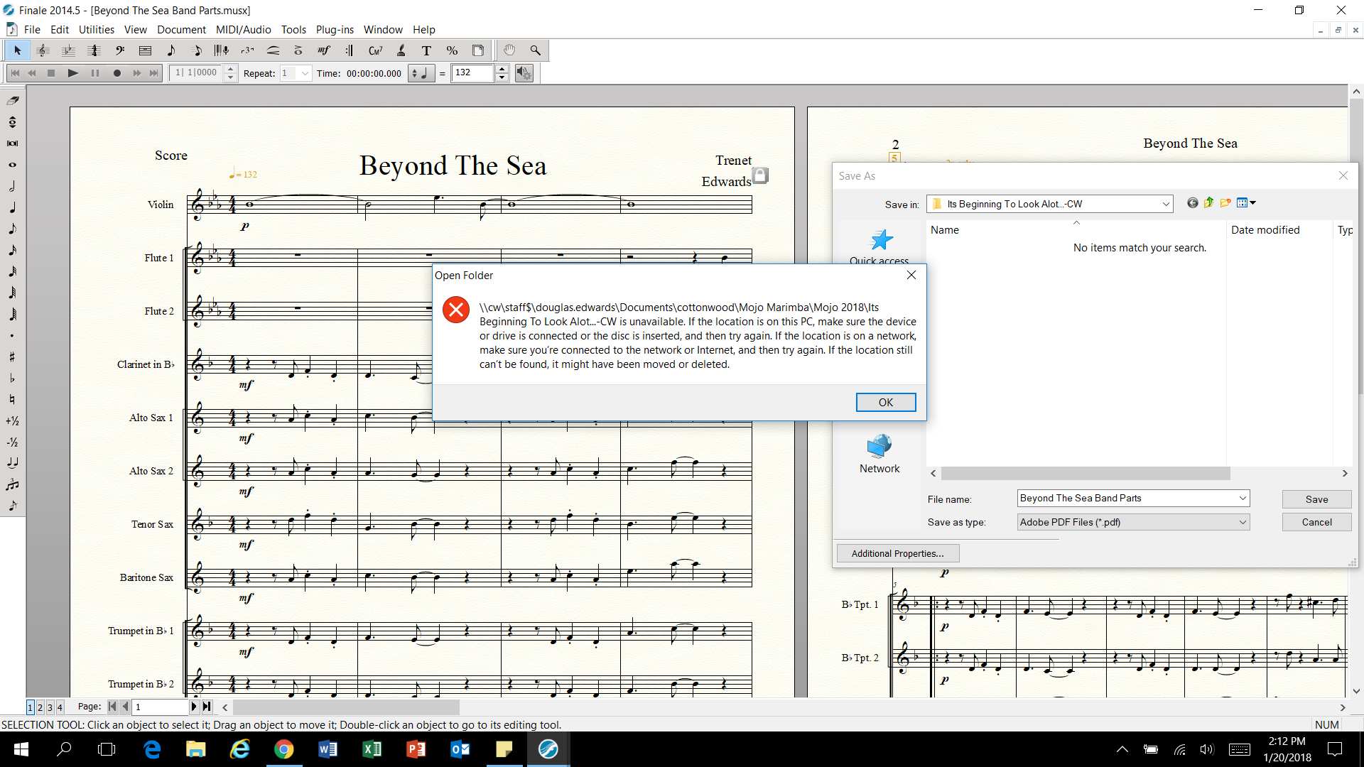Every time I choose export to pdf an error message pops up. The error message then freezes there. Neither the ok button nor the close button will function. And of course I cannot create any pdf's either. The message tells me that a pathway is broken. It pops up a side window asking me to save an old file I'm not even working on. It looks like this:
