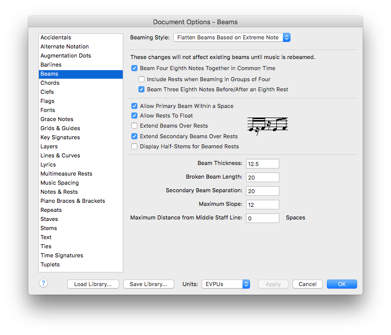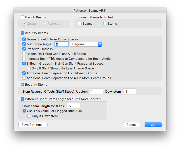 I'm working on somebody else's old project, and having strange experiences with the (wonderful) Patterson Beams plugin (v5.11, running on Finale 25.5.0.259 on a Mac). Hard to describe -- sometimes it works fine on a selected passage; other times it seems like it's not running at all. I noticed a bunch of beams that didn't seem to be "hanging" properly (see the slivers of white), so I ran "Clear Selected Items" to remove Stem and Beam Alterations, but nothing moved: