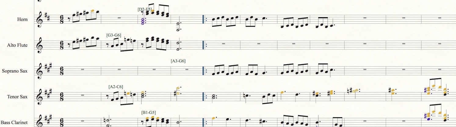 I have out of range set as dull-yellow notes. The numbers in square brackets indicate the usual range of the instrument - I looked them up so I could avoid out of range notes. :-)