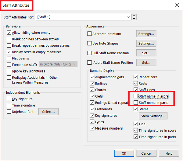 Thank you so much, J ADRIAN VERKOUTEREN and Jeffrey Turner .    Yes, i have created a template for lead sheets.  It was used to prepare the chart shown above.  One of its features is what you suggest;   "STAFF NAME IN SCORE / PARTS" is unchecked.