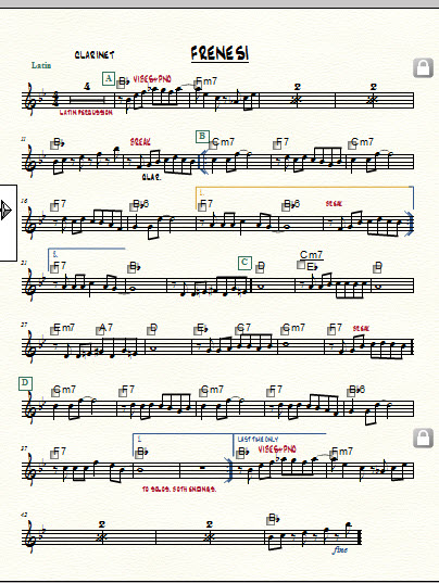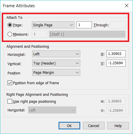 The texts shown here in red are created by clicking on the text tool and then double-clicking at the spot where the text is to be inserted.  Right-clicking on the text brings up "EDIT FRAME ATTRIBUTES."   The default is "ATTACH TO SINGLE PAGE."   If the document is later reformatted, the text ends up in the wrong place.   By contrast, "ATTACH TO MEASURE #___" guarantees the text will remain with the proper measure.