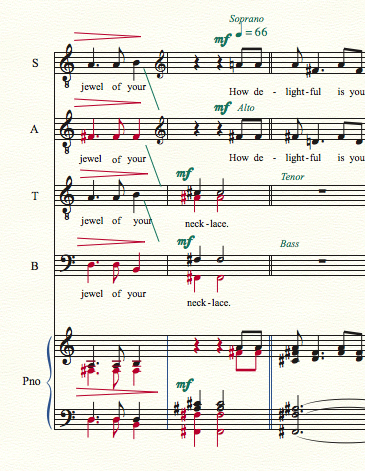 I am inputting choral music for one of my professors (he handwrites his music), and the piece is for TTBB choir and SATB choir w/ piano accompaniment. I originally had 8 staves for the choral parts. My Prof. requested, to reduce page numbers, that I use only four staves and switch between the two choirs. This switch happens early on with the beginning of the piece as TTBB, and then switching about 30 measures later to SATB for the rest of the piece.