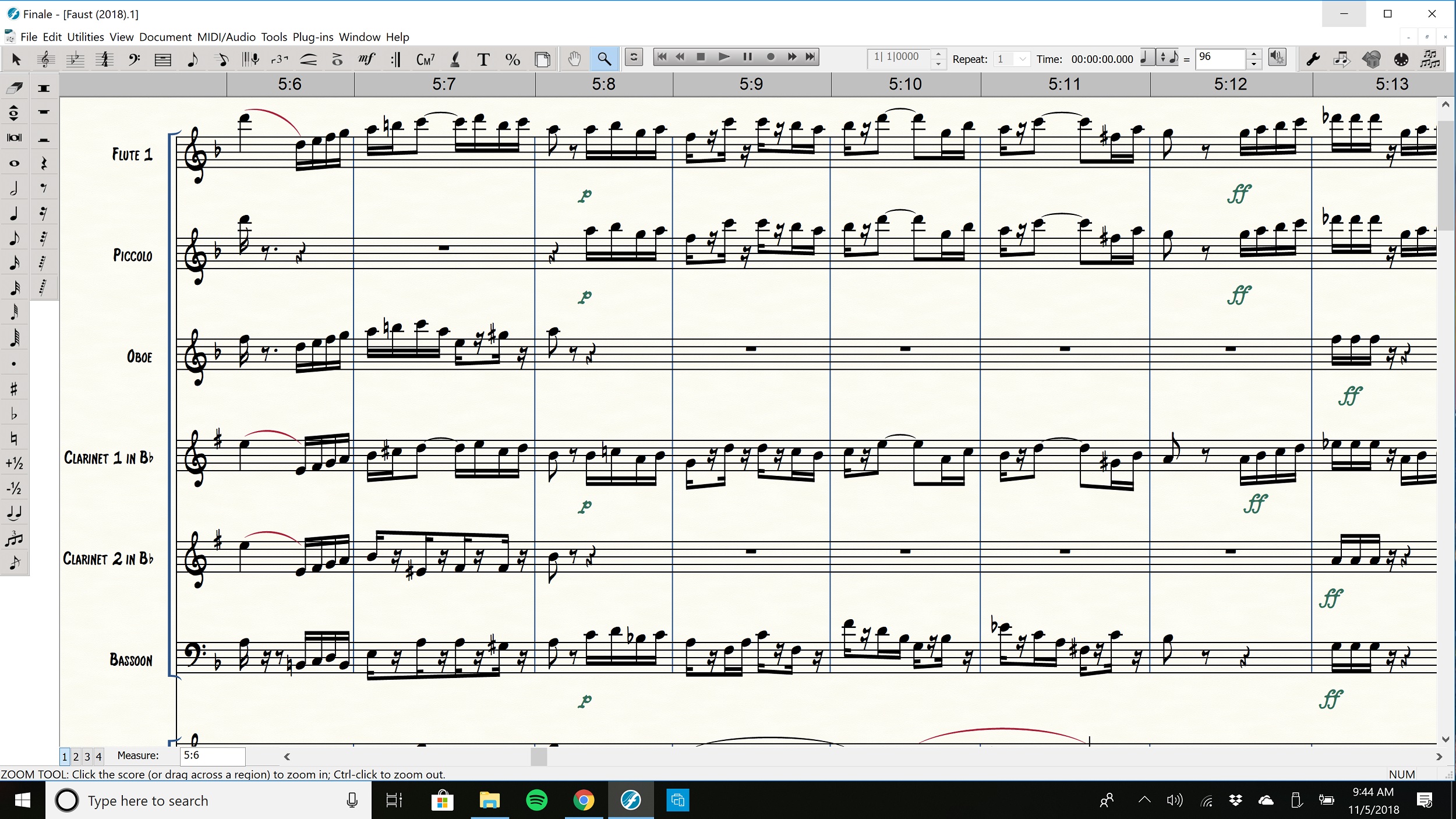 I'd like to see the secondary beams extended over the 16th rests (when connecting 16th notes to 16th notes) in instances such as in the clarinet & bassoon parts in measures 5:7 (pic 1), but NOT having a broken 16th note beams extended such as in the flute/picc/clar. 1 parts in measures 5:10, 5:11 (pic 2). In other words for the latter example, anytime the beat rhythm is "16th note, 16th rest, 8th note" there should be no reason for that first 16th note beam to be extended.