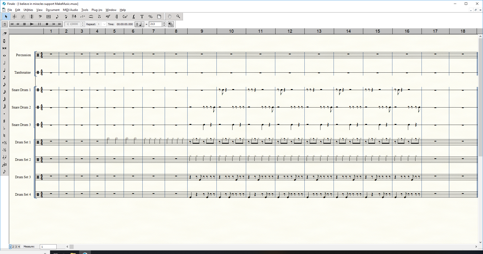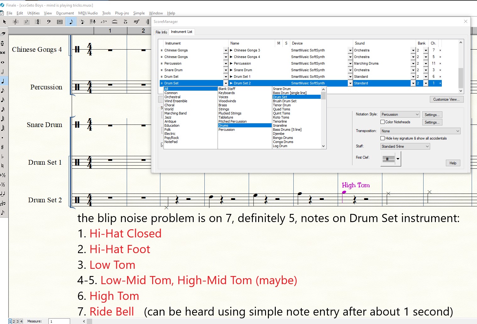 Hi, I keep hearing a pop sound, or like snip sound when I use the drum set instrument, particularly the hi-hat. Do you hear this pop/snip sound if you play this file? It's most easily heard when the hi-hat does quarter notes in the 3rd and 4th bar of music. I'm also sending screen shots of my settings and a screen shot of how perhaps the wav files when adjacent to each other, sometimes I've heard this same snip sound. The last screen shot has nothing to do with this file, it's just me trying to show readers here where the problem perhaps exists, when snippets of files are sequenced together, particularly a hi-hat. It's important to me because I also hear this in the Finale WAV File menu, export Audio to WAV, which is the actual media file I use for performance.