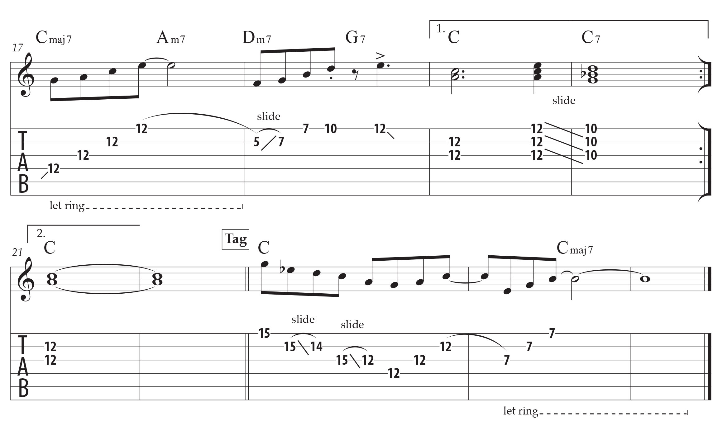 I've had this problem since Finale 2014.5. In the tab staff, slide symbols and slurs can skew away from the tab numbers taking up more vertical space than is necessary. These symbols should appear in the space *between* the tab staff lines. If they skew into the tab staff lines, it creates visual confusion as in measures 18 and 23 in the attached graphic.