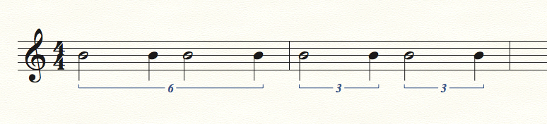 For m. 1, I set the tuplet definition to 6 quarters in the space of 4 quarters, and in m. 2, 3 quarters in the space of 2 quarters.