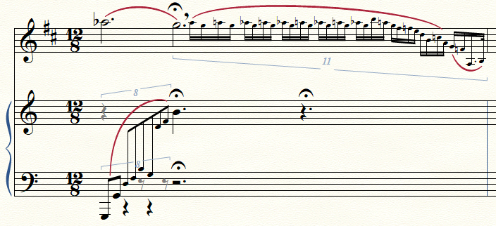 Can someone help me with this one? The music bellow is written in 12/8 time with a cadenza in the solo clarinet part. The other problem is the lefthand piano part flows over into the right hand. I solved the cadenza by changing the keysignature to 27/8, however, this caused problems in the piano part with an excess of rests which I could not hide and seemed to continue into the final two bars.