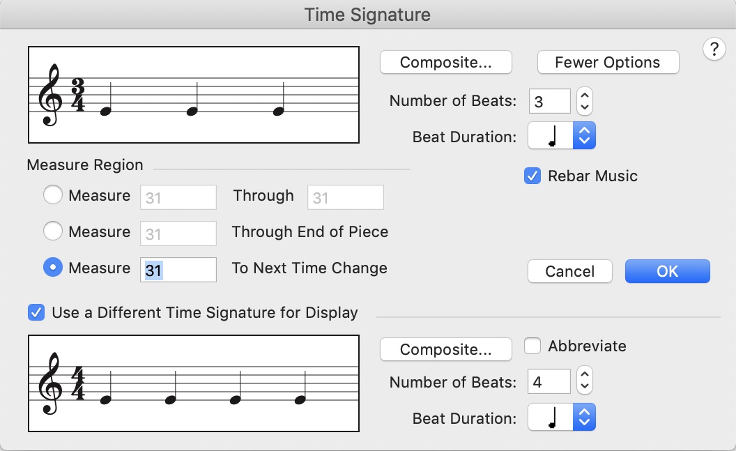 For the last measure, set the “real” time signature to 3/4, and set the “display” time signature to 4/4: