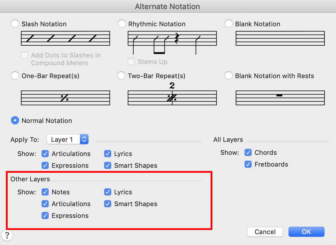 I'm running Finale 2014.5 on an iMac 10.11. I'm working on a score where the trumpet has some extended rests. To help keep the player engaged while counting rests, I put cues from the violins in the trumpet part. I used the plugin to create the cue notes so the cues are in Layer 4 in the trumpet part. They display just fine in Score View but they disappear when I view just the trumpet part on its own, either in scroll or page view. The label for the cue notes is still visible but there's no notation on the staff. What am I doing wrong?
