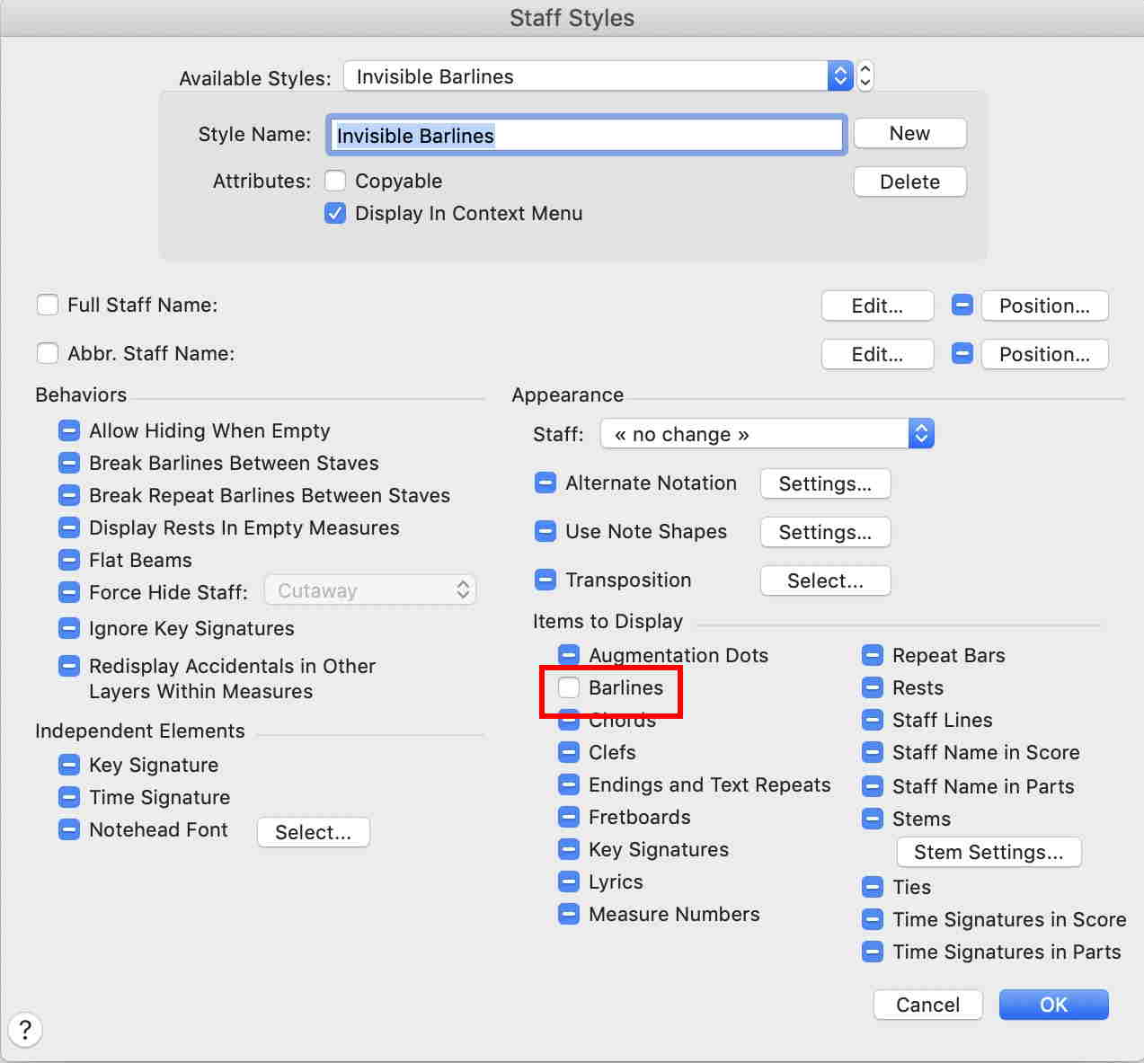 How do I remove(or Invisible) the only Flutes part bar lines?