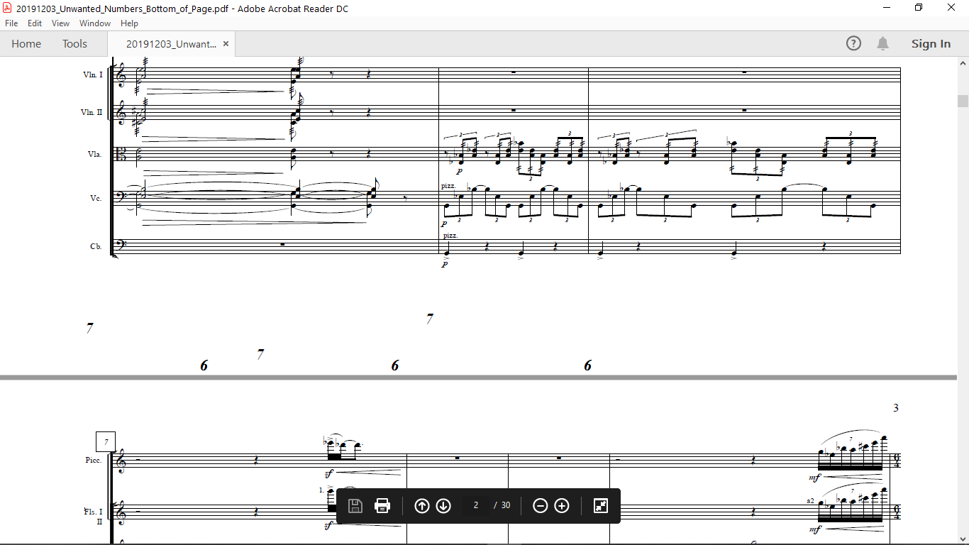 As with the post from a year ago (where v25 for Windows 10 was used), the unwanted numbers appear to be associated with incidences of "tuplets" used in the score. Below is a screen print showing the bottom margin of page 2 of one 30-page score (where the issue occurs on 13 pages):