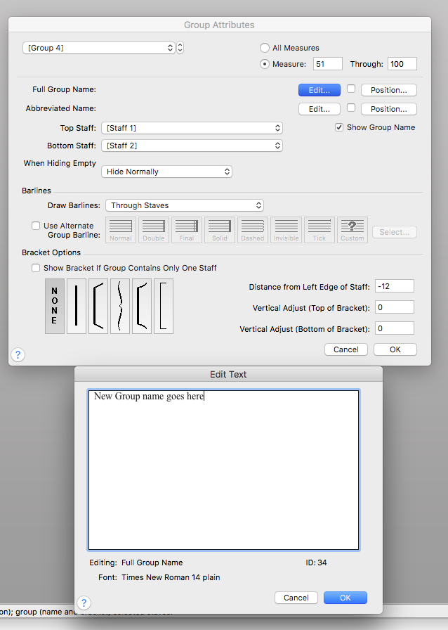 I'm currently working on a large-scale orchestra arrangement. One of the things I'm having trouble with is naming staves/groups. More specifically, there are times where I would want three staves for horns, and times I only want two (I already know how to hide the third staff in certain sections). The horns would be in a groups that is named such, but the staves that show the part division (see image), I have no idea how to change it mid-score. I only know you can make the first page different from the rest (because abbreviation), but that isn't what I'm looking for. This also happens in a few other instruments (flute switching to piccolo, bassoon to contrabassoon, etc.), but it's most prominent/common in the horns.