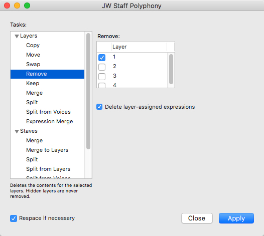 (1) JW Staff Polyphony plugin... This works extremely well with one big exception: Once I have removed a layer it disappears from the score but it is still hear on playback.