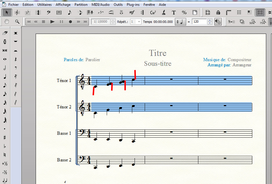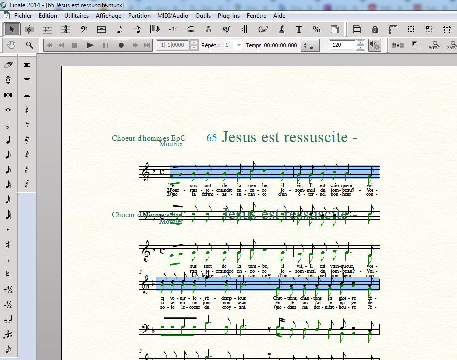 1) Pour un choeur d'hommes, il m'arrive soit de réécrire de vieilles partitions et pour les apprendre, je les écris dans un système à 4 voix, ce qui permet d'écouter chaque voix, soit je les scanne avec SmartScore X2 Songbook, les corrige et les importe dans Finale. Elles sont alors du format courant: système double avec 2 voix par portée.