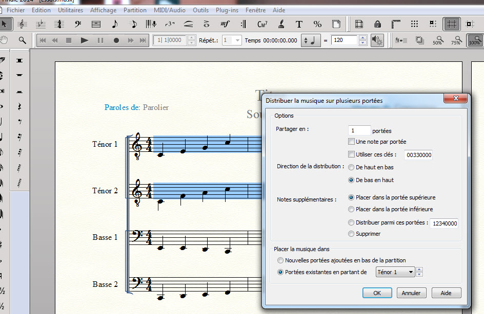 1) Comment faire pour n'avoir qu'une voix dans la 1ère portée et seulement la seconde voix dans la portée rajoutée.