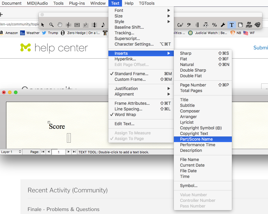 In your score, you've typed the word "Score". That's not what you should do. You need to use the "Part/Score name" insert under the text tool.