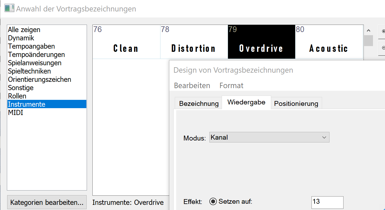 First, I tried using the "change instrument" functionality, but since I cannot add own instruments, I needed to "misuse" non-used instruments (such as Banjo) and change their playback configuration and name afterwards. This feels quite hacky.