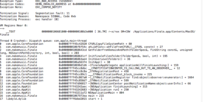 From your crash report here, I can see that the crash is from Finale not connecting with the Documents folder. There can be several reasons for this. I saw that you submitted a support ticket as well, so I will get in touch with you directly through that ticket shortly to trouble shoot the issue with you.